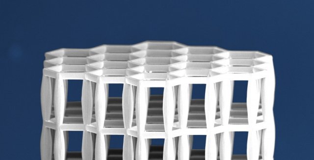 卡尔斯鲁厄理工学院的研究人员受到骨头与蜂窝启发,研发出这种多孔和非实心的壳体结构轻质材料,坚固且不易破裂。据介绍,这种材料的内部结构与木屋相似,具有水平、垂直、对角支撑等特征,而“横梁”的长度不到10微米。生产这种微结构材料需使用3D激光光刻技术。