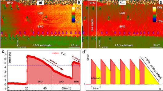 金属所沈阳材料科学国家(联合)实验室的固体原子像界面结构研究团队长期致力于材料基础科学问题的电子显微学研究,经过多年的学术积累,在解决上述基础科学难题方面近来取得突破。他们在利用脉冲激光沉积技术生长氧化物异质界面过程中,采用高通量模式,使BiFeO3/LaAlO3(001)界面产生新奇的、具有面外分量的a[011]刃型位错阵列。像差校正电子显微分析表明,这种新型位错阵列具有晶格旋转效应(类似弹性弯曲变形),使BiFeO3纳米结构中产生高达106/m的线性应变梯度。这种巨大的线性应变梯度通过弯电效应产生了数兆伏/m的内建电场(与传统半导体p-n结或肖特基结的内电场相当),同时也大幅度拓宽了BiFeO3纳米结构的可见光吸收范围。这表明巨大的线性应变梯度可实现对带隙的连续调控,进而影响光电响应特性,增强其光催化特性等。