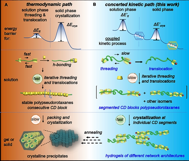 聚假轮烷晶体或水凝胶的形成可分为两个步骤,分别为穿环/滑动过程和结晶过程。相较于结晶过程,穿环过程一般具有更低的能量势垒。因而在结晶前,位于高分子轴上的环糊精能有更长的时间弛豫至其热力学稳态,由此生成的聚假轮烷沉淀具有更高的结晶性,很难捕获无定形的动力学产物。穿环/滑动过程和结晶过程能量势垒的高度不对等导致化学反应更倾向于热力学路径,若想获得动力学产物,必须恰当地调节这两个过程的能量关系。研究人员通过化学合成的手段,在聚合物轴上修饰能提高穿环过程能量势垒的化学基团(以金刚烷和降冰片烯为例),不仅提高了穿环/滑动过程的能量势垒,亦降低了结晶过程的能量势垒,实现了两个反应过程的能量匹配,提出协同动力学控制的理念,从而使捕获聚假轮烷的亚稳态产物成为可能。