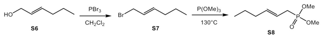 采用文献方法[2],从炔醇S1出发,由Red-Al还原炔烃,再由NBS溴代得到溴代烯烃一级醇。利用三苯基膦和四溴化碳的作用,可以将溴代烯烃一级醇转化生成二溴化合物S3。二溴取代的烯烃S3可以用于制备Horner试剂,在氢化钠作用下,和亚磷酸三甲酯或者是亚磷酸三乙酯反应,分别生成Horner试剂S4和S5。针对不含溴原子的Horner试剂的合成,本研究也采用了2-己烯-1-醇(S6)作为原料,通过三溴化磷发生一个溴代反应,然后和三甲氧基磷在130摄氏度下,生成不含有溴原子的Horner试剂。