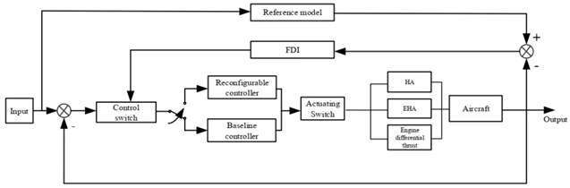 飞机液压系统是飞机驱动系统的重要组成部分,液压系统的失效导致近年来一系列灾难性事故的发生。水力损失的原因可能是泄漏、堵塞或结构损坏。幸运的是,多电飞机 (MEA) 的发展为解决这一难题提供了新途径。针对液压系统总损失和驱动系统故障,创新设计了主动容错控制方法 (AFTC)。本文重点研究了两种情况:飞机液体泄漏、堵塞和垂直尾部损伤。针对飞机泄漏、堵塞,将不同冗余驱动系统 (DRAS) 应用于MEA中,当整个液压系统发生故障时,液压驱动系统 (HA) 转换为电液驱动系统 (EHA);根据二者的差距,创建退化模型。针对垂直尾翼损伤,首先采用发动机差速推力控制,来帮助恢复横向稳定性。同时创建了发动机推力动力学模型,和发动机差推力与舵偏转之间的映射关系。最后基于模型参考控制 (MRC) 和线性二次调节器 (LQR),设计出AFTC,通过与美国国家航空航天局 (NASA) 通用运输模型 (GTM) 的比较仿真,验证了该方法的正确性。