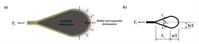 如图4所示,当圆弧-钢销界面无摩擦时,圆弧段的张力为定值 (即分支的张力 (Ts))。而当界面粗糙时,张力从起点到顶点沿弧线逐渐减小,且在顶点处取得最小值,并且张力下降的速率随着摩擦系数的增加而进一步增加。另外可以看出,摩擦系数对张力下降率的影响随着摩擦系数的增加而减弱,可以证明,这种影响会逐渐收敛于零。对于p(φ),因它的值等于同一点张力的1/r倍,故径向压力分布的规律与图3所示的分布规律完全一致。如果考虑弹性变形,钢销会在径向压力的作用下产生向内的变形,变成一个如图4a所示的椭圆状。相应地,U型锚头的力学模型也变化成如图4b所示的模型。