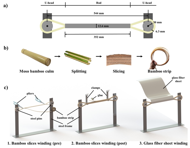 图1. (a) BFRP筋试样尺寸;(b) 竹篾制造过程;(c) BFRP筋制造过程。