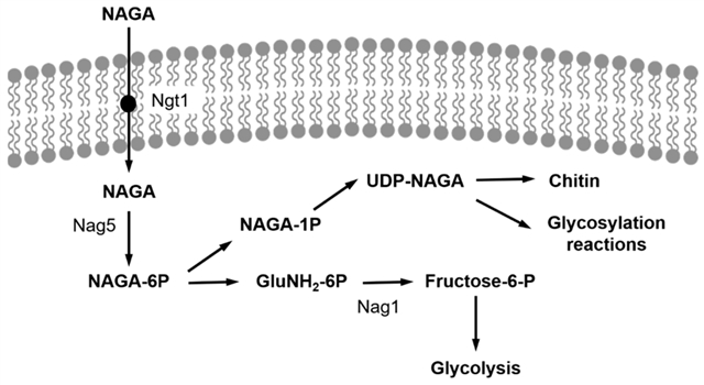 图1. 解脂耶氏酵母中NAGA的利用途径。