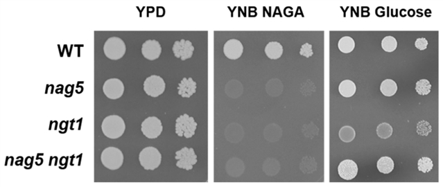 如图1中NAGA的摄取需要转运蛋白Ngt1,它可以在Ylnag5突变体中积累。野生型菌株中YlNGT1基因的缺失阻碍了其在NAGA中的生长 (图2),从而证实了解脂耶氏酵母中没有其他相关的氨基糖转运蛋白。在解脂耶氏酵母细胞中,Ylgt1 nag5双突变体也被成功构建,并在其中检测出Nag1的活性。如图3所示,该双突变体中的Nag1活性与在葡糖生长的Ylnag5单突变体相近,说明在葡糖生长的Ylnag5突变体中NAG基因改变不是由胞内NAGA积累造成的。