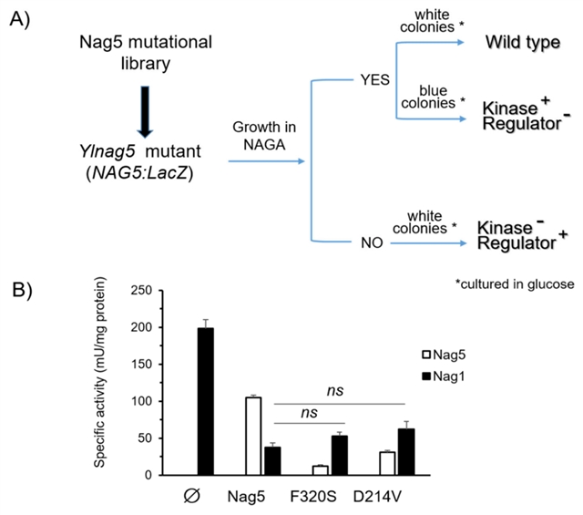 随后,研究人员通过蓝白版筛选实验确认Nag5酶活性与其调节能力没有相关性。研究人员发现其可在NAGA中生长,并在葡萄糖中呈蓝色的转化体中发生了基因突变。对这些突变位点的研究表明,Ylnag5突变体表现出降低的激酶活性 (如图5B)。然而,Nag1的活性在所有这些菌株中都相似。