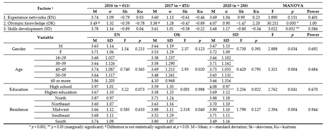 首先,作者通过平均分和标准差分析数据,检查了偏度和峰度值,以评估测量值是否足够接近正态分布,并可用于进一步的因子分析,然后进行了多元方差分析,以检查不同时期教育传统观念 (EN、OK、SD) 之间可能存在的差异。此外,为了检查社会人口变量和无形遗产之间的关系,本研究使用IBM SPSS 26.0进行了一系列MANOVA (表1)。最后,研究团队基于奥运会无形遗产的理论框架,设计了一个纵向轮廓来估计潜在增长曲线模型。