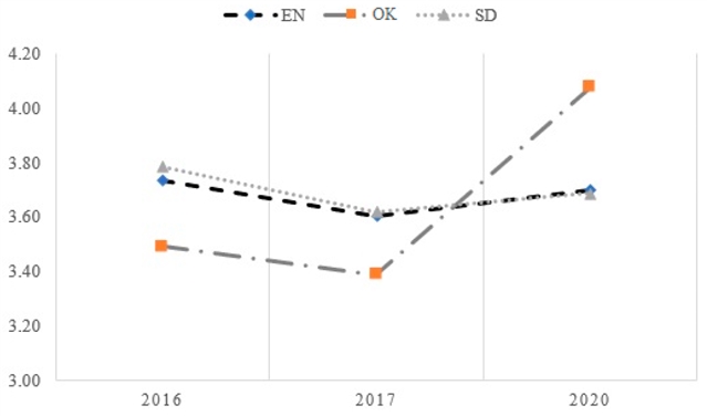图1. 教师在不同时间点的看法不同。EN-体验网络;OK-奥运知识;SD-技能发展。