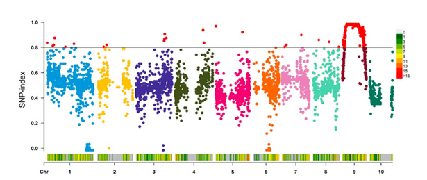 为了定位 dnl2 基因,研究团队将杂合植株 (+/dnl2) 与 Mo17 自交系杂交,构建 F2 分离群体。在 F2 群体中挑选64株矮化突变体提取 DNA,并利用基于靶向基因型检测技术 (Genotyping by Target Sequencing, GBTS) 进行了基因型分析。筛选出7357个单核苷酸多态性标记,占标记总数的36.3%。每个染色体上的 SNP 标记数平均为736个,1号染色体上的 SNP 标记数最大为1298个。作者通过分析全基因组水平上所有多态性 SNP 对应的 SNP-Index 变化,发现9号染色体上26.9M-76.1M区间与目标性状显著相关 (图5)。