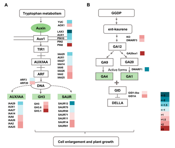 图6. DEGs 参与植物激素的生物合成和信号转导。(A) 参与生长素的生物合成和信号转导的差异表达基因。(B) 参与赤霉素的合成和信号转导的差异表达基因。深蓝色和深红色分别代表低表达和高表达。