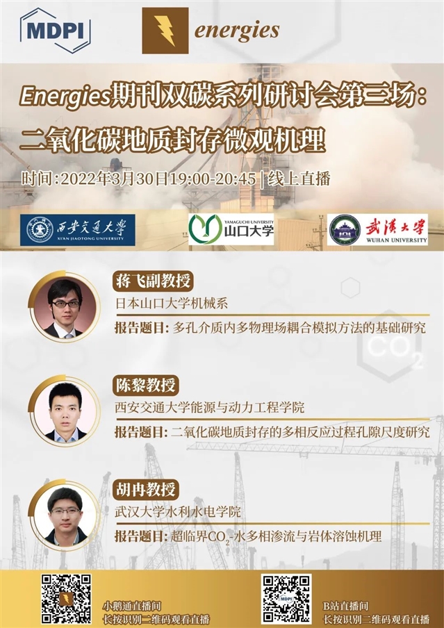 近年来由于温室气体大量排放而引发的全球气候变化问题备受关注,二氧化碳减排技术尤其是二氧化碳地质封存技术也受到越来越广泛的重视。本次系列线上研讨会,Energies 期刊非常荣幸地邀请到了来自全球8所知名高校与研究机构的9位资深学者,他们将以双碳议题中“二氧化碳地质封存关键输运过程”为主题,于2022年3月28日-30日展开为期三天的系列研讨会。同时,MDPI出版人吴超宇女士也会向大家简单介绍Energies 期刊以及开放获取期刊的出版优势。