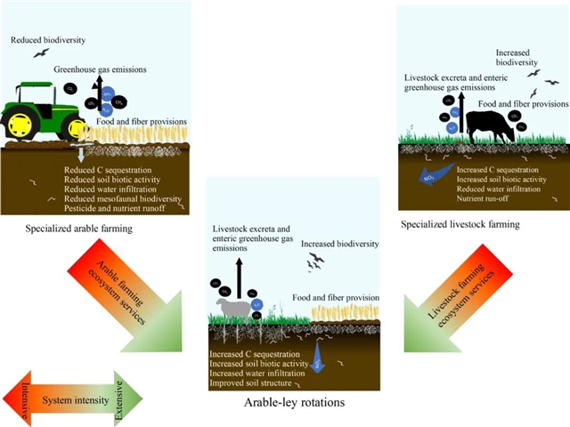 2100年全球预估人口将增至109亿,需要通过可持续的集约化农业系统增加约48.6%的粮食产量。然而目前的农业管理是不可持续的,大量投入农用化学品和肥料导致温室气体大量排放,害虫和除草剂抗性增加,生物多样性丧失,以及土壤退化等问题。土壤退化是农田土壤生态系统服务面临的主要威胁。许多欧洲国家为提高农业生产效率与生产力,连续种植单一作物,加剧了土壤质量下降。在世界许多地区,与集约化农业相比,通过引入农牧结合系统可增强农业系统的气候适应性、环境可持续性和经济可行性;该系统采用草田轮作,种植不同类型的牧草来提升土壤质量和生产力,如豆科牧草可通过共生固氮增加土壤肥力,有利于减少对后续作物无机氮的投入。当前研究主要集中于多物种牧草对牲畜健康和生产力、牧草产量和温室气体排放的影响,而对多物种牧草提升耕地土壤质量的研究较少。本综述重点讨论在作物轮作中引入多物种牧草和牲畜放牧的潜在效益和影响,包括生态系统服务、土壤结构、土壤碳氮循环、牲畜温室气体排放、牲畜生产力和农业可持续性。