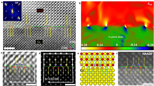 原位氧化金属铜单晶薄膜所形成的Cu2O/Cu界面为观察错配位错和界面相变的动态相互作用提供了理想的平台。Cu和Cu2O本身具有较大的晶格错配度(约14.5%),所以热力学上是无法形成稳定的共格界面。一系列错配位错的引入能够有效地释放界面应变能,进而导致半共格界面的产生。
