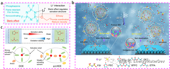 图6. 用于WSE的氟化溶剂。(a)PFPN分子结构以及作用示意图,图片版权@ACS;(b)FEC/BTFC/ETFA电解液结构示意图及其作用机理,图片版权@ACS;(c)q-LHCE电解液设计原理示意图,图片版权@Wiely。