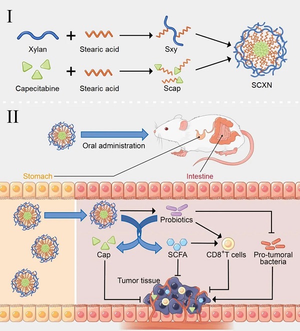该研究合成了两亲性的木聚糖-硬脂酸偶联物(Sxy)。Sxy在水中可自组装形成纳米粒,并将硬脂酸修饰的Cap包裹在纳米粒内核中,获得载Cap益生元纳米粒SCXN。研究显示,口服给药后,SCXN在胃部稳定,在肠道特定细菌的作用下,木聚糖逐渐降解,纳米粒解离并持续释放Cap,与游离药相比可减缓Cap被小肠吸收进入血液循环的速度,减慢清除,增加瘤内蓄积,提高肿瘤细胞杀伤效率。同时,木聚糖降解后提高了肠道益生菌比例,降低了致癌菌比例,增加了有益代谢物短链脂肪酸的含量。研究在荷CT26及MC38结肠癌小鼠模型中开展的药效评价结果表明,与游离Cap相比,SCXN口服后增加了瘤内CD8+T细胞数量,减少了调节性T细胞数量,增强了抗肿瘤免疫应答,肿瘤抑制率从5.29%提高至71.78%。此外,SCXN具有良好的生物相容性,可使结肠癌模型小鼠的中位生存期从14天延长至33.5天。该基于益生元的肠道菌群调节-化疗一体化纳米递送系统有望为CRC治疗提供新策略。