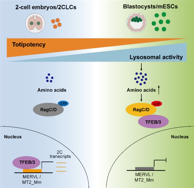该团队首先发现小鼠胚胎干细胞进入二细胞样状态(类全能性状态)时溶酶体活性下降,同时溶酶体抑制剂处理促进小鼠胚胎干细胞进入二细胞样状态,并且提高了二细胞样状态的稳定性。这些结果表明溶酶体活性可以在小鼠胚胎干细胞中起到抑制全能性状态的功能。