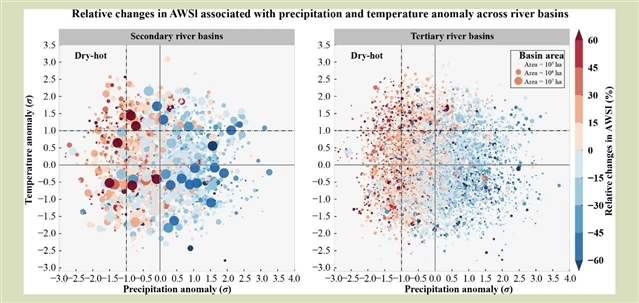 对于温度异常>+2.5的极端高温年份,二级流域和三级流域的AWSI分别比多年均值增加19%和15%。在高温年份(温度异常 > +1.0),二级流域和三级流域的AWSI相较于多年均值增加约7%。