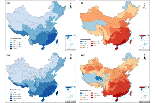图1 二级流域 (a, c) 和三级流域 (b, d) 年均降水和温度分布 (审图号:GS京 (2024) 1698号)。