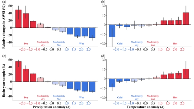 图4 AWSI对降水和温度异常的响应。对于二级流域 (a) 和三级流域 (b),降水异常 < –1.0的年份定义为干旱年,> +1.0的年份为湿润年。同样,在二级流域 (c) 和三级流域 (d),温度异常 < –1.0的年份定义为低温年,> +1.0的年份为高温年。