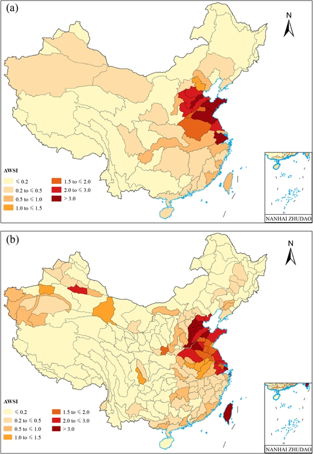 1971至2010年,我国二三级流域AWSI分布呈现显著的区域差异 (图2)。AWSI高值流域主要集中在西北部、北部和中东部地区,尤其是华北平原。而南方地区的AWSI较低,可见AWSI的分布并不均衡。此外,研究发现,将AWSI汇总到二级和三级流域时,差异较为显著。三级流域的水短缺程度更加严重,AWSI大于1的流域较多。
