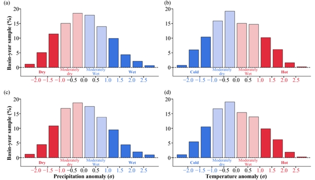 图5 二级流域 (a, c) 和三级流域 (b, d) 在不同降水和温度异常区间的“流域–年”样本占比 (%)。