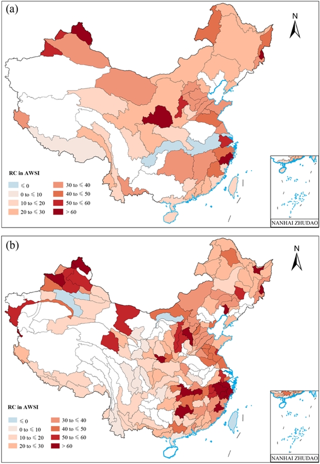 图2 1971–2010年我国农业水短缺指数在二级流域 (a) 和三级流域 (b) 的分布 (审图号:GS京 (2024) 1698号)。
