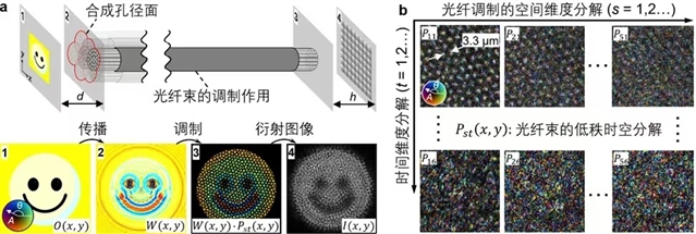 图2:(a)合成孔径叠层成像内窥镜成像模型。(b)光纤束的低秩时空分解