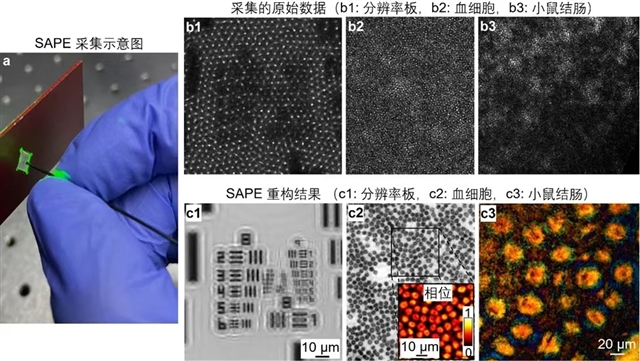 SAPE的无镜头设计允许其对镜头难以到达的区域进行成像。凭借其548纳米的分辨率和超过2厘米的扩展景深,SAPE能够对复杂的非平面表面进行高分辨率成像。图3比较了未经处理的采集图像以及SAPE的重构结果。
