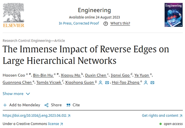 引用信息:Haosen Cao, Bin-Bin Hu, Xiaoyu Mo, Duxin Chen, Jianxi Gao, Ye Yuan, Guanrong Chen, Tamás Vicsek, Xiaohong Guan, Hai-Tao Zhang, The Immense Impact of Reverse Edges on Large Hierarchical Networks, Engineering, 2024, 36:238–247.