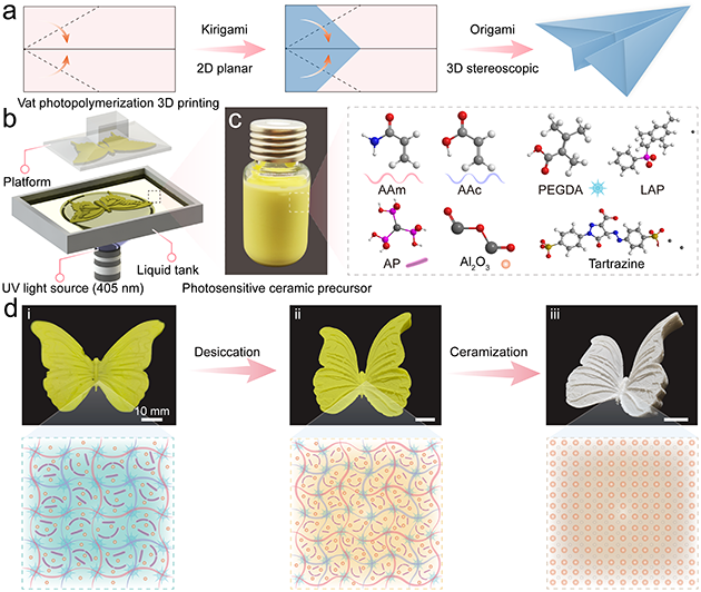 该团队受折纸/剪纸艺术的启发,以水性无机粘结剂磷酸二氢铝溶胶为水凝胶单体分散介质,将水凝胶单体和纳米陶瓷粉体混合来制备光敏性水凝胶陶瓷浆料;利用光固化3D打印获得了具有优异的延展性、形状适应性、抗疲劳性且可二次变形的水凝胶柔性骨架;依次经过脱水干燥、低温脱脂和高温烧结等步骤,实现了具有超低收缩、高陶瓷产率和形状保真度的悬空大跨度陶瓷结构。该工作设计的柔性水凝胶基陶瓷前驱体能够实现从平面形状到3D立体结构的转变,突破了传统硬质/脆性陶瓷前驱体制造复杂陶瓷结构的局限。