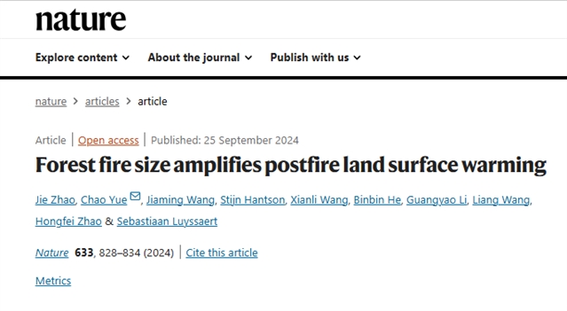 西北农林科技大学岳超团队于9月25日以“Forest fire size amplifies postfire land surface warming”为题发表在《Nature》正刊上的文章系统揭示了极端大火对生态系统破坏性、林火碳排放和地表气候反馈的放大效应,该研究赵杰为第一作者,岳超研究员为通讯作者。