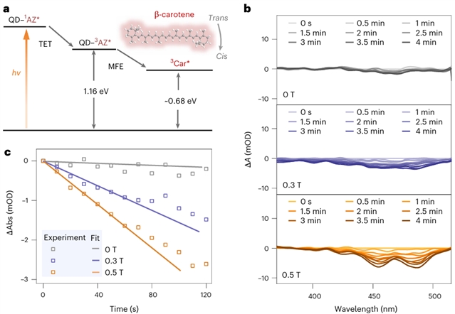 图5:磁场调控的稳态光化学反应。 (a) 基于QD-AZ磁场效应调控β-胡萝卜素光异构化的示意图;(b) 在QD-AZ体系的调控下,β-胡萝卜素光异构化在不同磁场强度下稳态吸收光谱随时间的变化;(c) 不同磁场强度下,β-胡萝卜素光异构化对应稳态吸收随时间变化的具体数值。