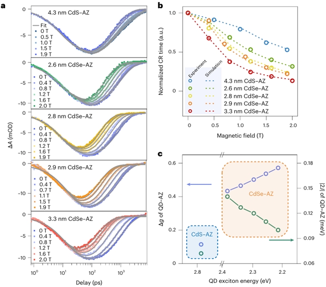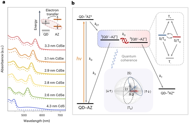 图1:CdSe(S) QD-AZ杂化体系的光谱表征与动力学过程。 (a) 不同尺寸的CdSe QD与CdS QD与AZ杂化前后的稳态吸收光谱;(b) 在外磁场的作用下,激发AZ后QD-AZ体系经历的动力学过程。