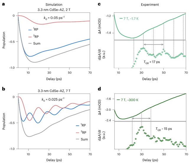 图3:量子拍频的理论模拟及实验观测。以3.3nm CdSe QD-AZ体系为例,杂化自由基对中自旋单线态、三线态与二者的加和随时间的分布:(a) 外磁场为2T,退相干速率k0 = 0.05ps-1;(b) 外磁场为7T,退相干速率k0= 0.025ps-1;3.3nm CdSe QD-AZ体系在 (c)7T、1.7K与 (d) 7T、300K条件下的电荷复合的动力学(上图)及动力学信号的求导(下图)。强磁场下,团队在液氦温度与室温均观测了体系的拍频信号。