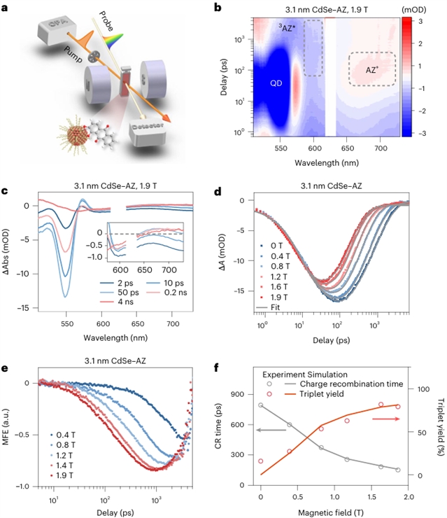 图2:3.1nm CdSe QD-AZ体系磁场效应的观测及动力学分析。 (a) 磁场调制的瞬态吸收光谱的光路示意图;(b) 在625nm激发、外磁场强度为1.9T的条件下,3.1nm CdSe QD-AZ体系瞬态吸收光谱的二维彩图;(c) 特定延迟时间下的瞬态吸收光谱;(d) 在不同磁场强度下,体系电荷分离与电荷复合的动力学及理论模拟结果;(e) 在不同磁场强度下,体系随时间变化的磁场效应;(f) 磁场强度依赖的电荷复合时间及三线态产率。