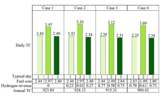 仿真分析部分,文章通过四个技术经济指标对比分析了不同典型日中,四种方案下系统的调度策略以及日运行总成本。最后,基于典型日的概率计算了四种方案的年运行总成本,如图3所示。