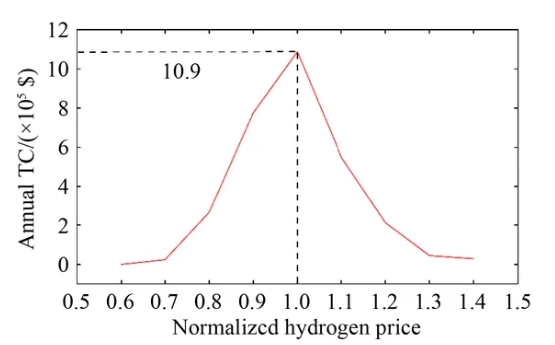 图5. 方案3和方案4年运行总成本的差值随相对氢气价格的变化(以氢气价格4.1美元/千克为基准)