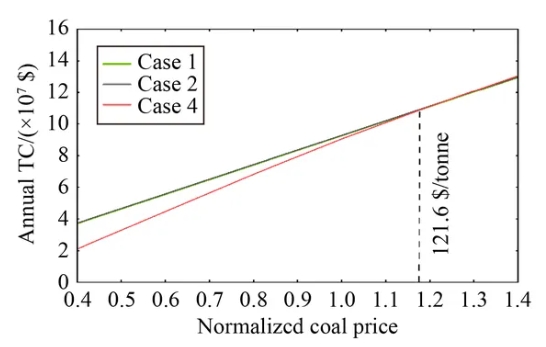 图4. 年运行总成本随相对煤炭价格的变化(以103.1美元/吨的煤炭价格为基准)