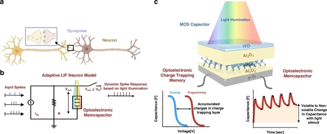 近日,阿卜杜拉国王科技大学Nazek El-Atab教授的研究团队在此领域取得突破性进展,团队开发了一种基于二硒化铪(HfSe2)的可重构金属氧化物半导体电容器(MOSCap)。这种器件不仅具有光电子突触特性,还能通过光刺激调整其电容及阈值电压,实现独立的学习行为,为模拟生物神经元功能提供了新的可能性。
