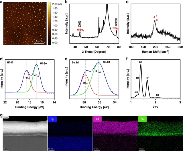 在这项研究中,团队采用逐层堆叠的方法开发了基于二硒化铪(HfSe2)的可重构金属氧化物半导体电容器(MOSCaps),由氧化物材料将二维(2D)材料包裹起来作为电荷捕获层(CTL),并通过X射线衍射等方法对材料的结构和成分进行了表征(如图2)。