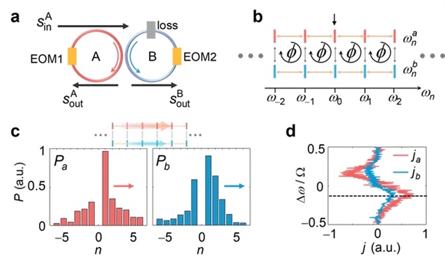 图2. (a) 电光相位调制下的两个等长度的光纤环形谐振腔系统;(b) 合成频率空间中构造的具有等效磁场和增益损耗的非厄米梯子型霍尔晶格模型;(c) 某个频率失谐处(图d黑色虚线)的两条链上的稳态模式分布;(d)实验测量的不同频率失谐处两条链上的边缘流。