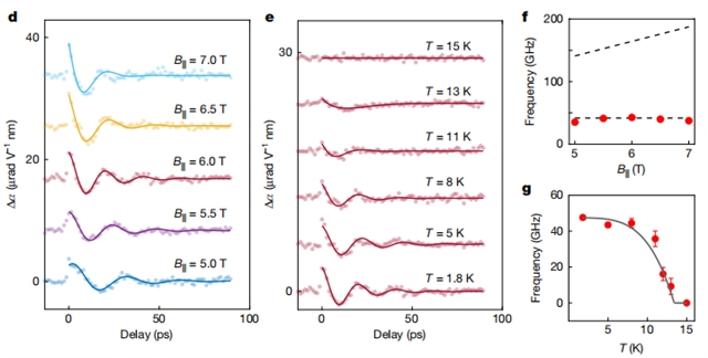 实验结果清晰地展示了θ角以约44GHz(千兆赫兹)频率进行周期性震荡,首次在实验上验证了轴子准粒子的存在。这种震荡表现为材料中磁电耦合系数的振荡,震荡幅度甚至达到静态值的12%,表明了强烈的动态响应。