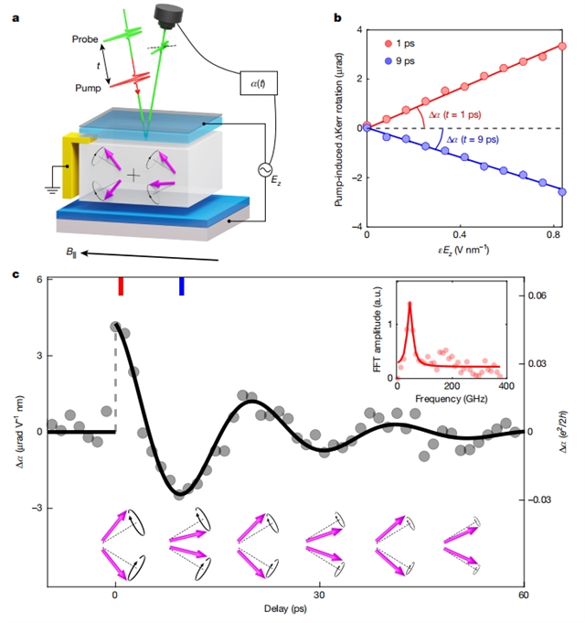 通过理论计算和材料建模,研究组发现这种θ角的动态震荡来源于材料中贝里曲率实空间偶极(Berry curvature dipole)的超快调制。而这一调制由“反相磁振子”激发所驱动,不仅响应强烈,而且在实验中可稳定观测。研究还发现,这种响应对载流子浓度和电场可控,为今后基于该机制的“可编程”量子器件提供了可能。