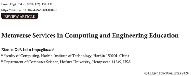 哈尔滨工业大学徐晓飞教授与美国霍夫斯特拉大学John Impagliazzo教授在Frontiers of Digital Education(《数字教育前沿(英文)》)期刊上联合发表了一篇名为Metaverse Services in Computing and Engineering Education(《计算机与工程教育中的元宇宙服务》)的文章,探讨了元宇宙服务在计算和工程教育中的应用潜力,并阐述了其如何推动教育转型。文章介绍了元宇宙的概念、特性和关键技术,重点分析了元宇宙教育服务的内涵、空间和应用方向。最后,文章强调了计算和工程教育的重要性,并呼吁将元宇宙服务纳入课程体系,以适应未来数字时代的需求。