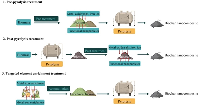 BNCs通过将纳米材料嵌入生物炭基质中,增强了吸附和催化性能,从而提高了废水处理效率。BNCs的制备方法包括预热解处理、后热解处理和靶向元素富集处理等 (图2)。这些方法可以显著影响BNCs的性质和性能。