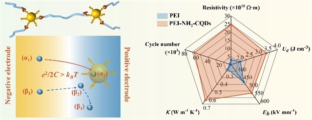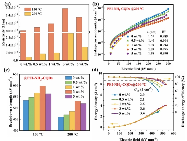 (1)库仑阻塞效应和CQDs形成的结合位点建立了双陷阱,显著提高了PEI的电绝缘性,与200 ℃下的纯PEI相比,PEI-NH2-CQDs的电阻率几乎增加了一个数量级。
