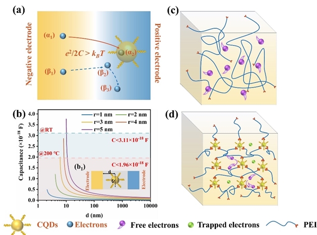 图5(a)库伦阻塞效应示意图;(b)电容与距离d的关系;(C)纯PEI和(d)PEI-NH2-CQDs中聚合物链和电子态的示意图