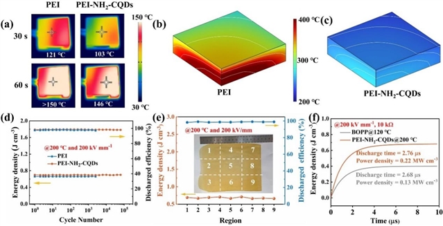计算,其中ρ是聚合物的密度,α是热扩散率,Cp是比热容。PEI-NH2-CQDs的K为0.65 W m-1 K-1,比纯PEI高2.5倍,比PEI-CQDs高2.2倍。非晶态聚合物的热导率主要依赖于声子在键合相互作用(共价键)中的传播。K的提高归因于交联电介质中分子链之间新的键合相互作用的贡献,这为声子提供了额外的传播路径。通过简单的温度测量设置可以直观地证明聚合物的增强散热能力,与PEI相比,使用PEI-NH2-CQDs作为扩散介质的陶瓷加热板的平均温度要低得多(图6a)。通过稳态分布模拟,PEI-NH2-CQDs在200 kV/mm电场下的峰值内部温度远低于PEI(图6b-c)。这种改进是由于混合材料的K值更高,电导率更低,这表明PEI-NH2-CQDs电容器非常适合高温应用。因此,与纯PEI相比,PEI-NH2-CQDs显示出优异的高温循环可靠性(图6d)。除此之外,PEI-NH2-CQDs电介质表现出高均匀性、快速放电时间和高放电功率密度(图6e-f)。这些结果强调了PEI-NH2-CQDs在实际应用中的巨大潜力。