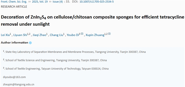 Lei Xia, Liyuan Shi, Jiaqi Zhao, Chang Liu, Youbo Di, Xupin Zhuang. Decoration of ZnIn2S4 on cellulose/chitosan composite sponges for efficient tetracycline removal under sunlight. Front. Chem. Sci. Eng., 2025, 19(4): 33 https://doi.org/10.1007/s11705-025-2534-5