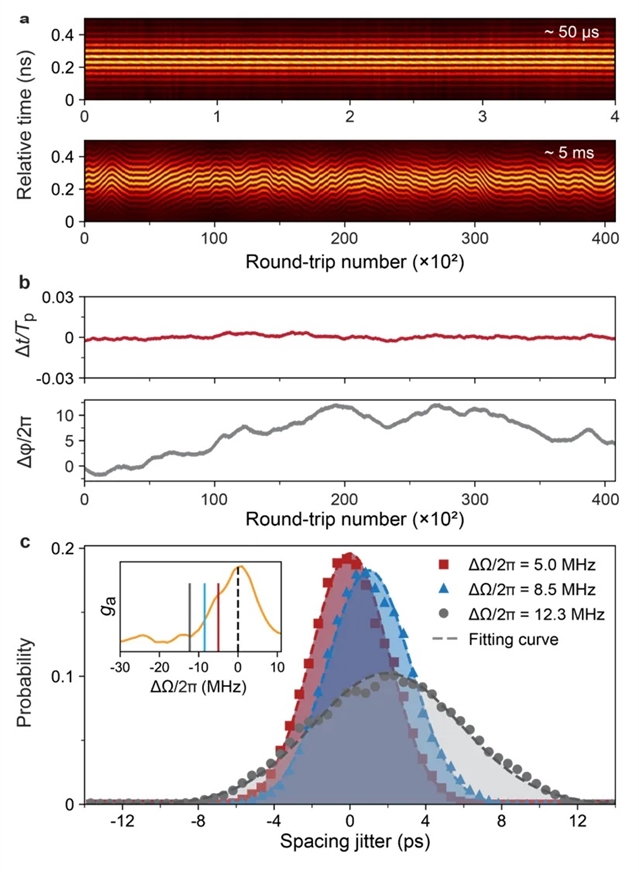 图4. 脉冲间抖动的测量结果。(a) 任意选择的脉冲对在连续往返中5 ms内的 TS-DFT 信号演变。(b) 上图:从 (a) 中检索到的间隔抖动 (Δτ),相对于脉冲序列离开激光器时的平均脉冲间间隔 Tp。下图:脉冲对之间的相对相位 (Δφ)。(c) 三个不同重复率失谐值的脉冲间抖动概率分布。插图:光声增益曲线。